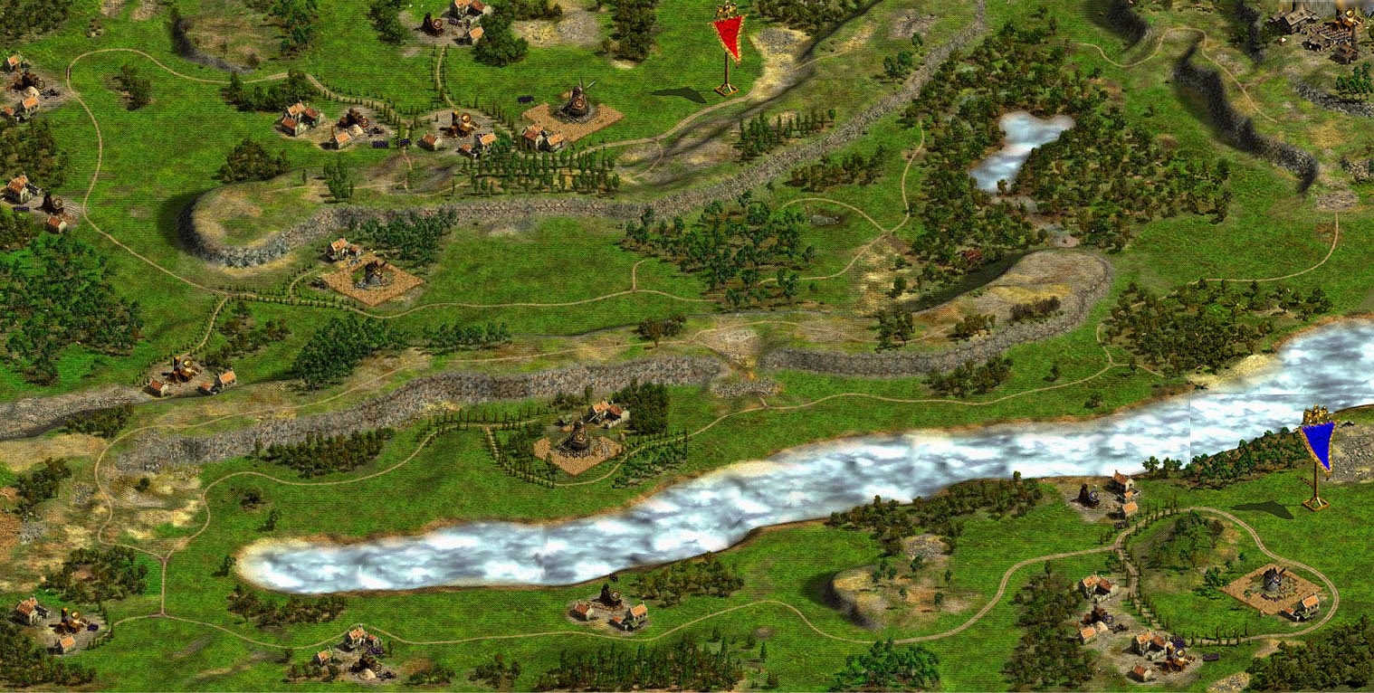 Между вашей с противником базой протянута длинная дорога, огибающая реку и горы. Вдоль дороги попадаются сёлы, и много стратегически важных мест.